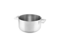 Design minimalista per un pentolame dalle elevate prestazioni. L'elevata conducibilità dell'alluminio puro si sposa con la praticità e l'igiene dell'acciaio. Acciaio Inossidabile 18/10, cuore in alluminio, esterno in acciaio per induzione. Superficie esterna ed interna lucidate a specchio. Maniglie con rivetti in acciaio inossidabile 18/10, a tenuta rinforzata.